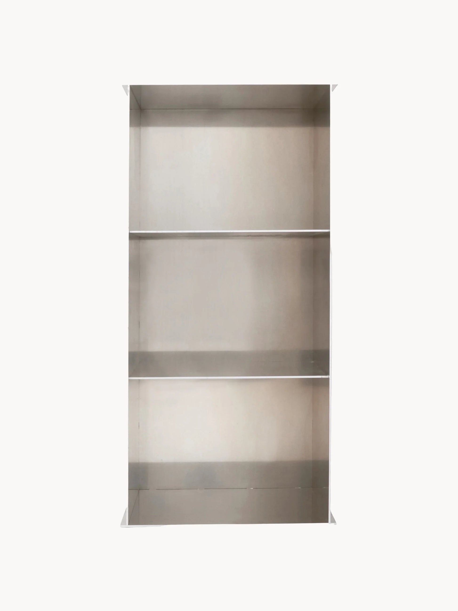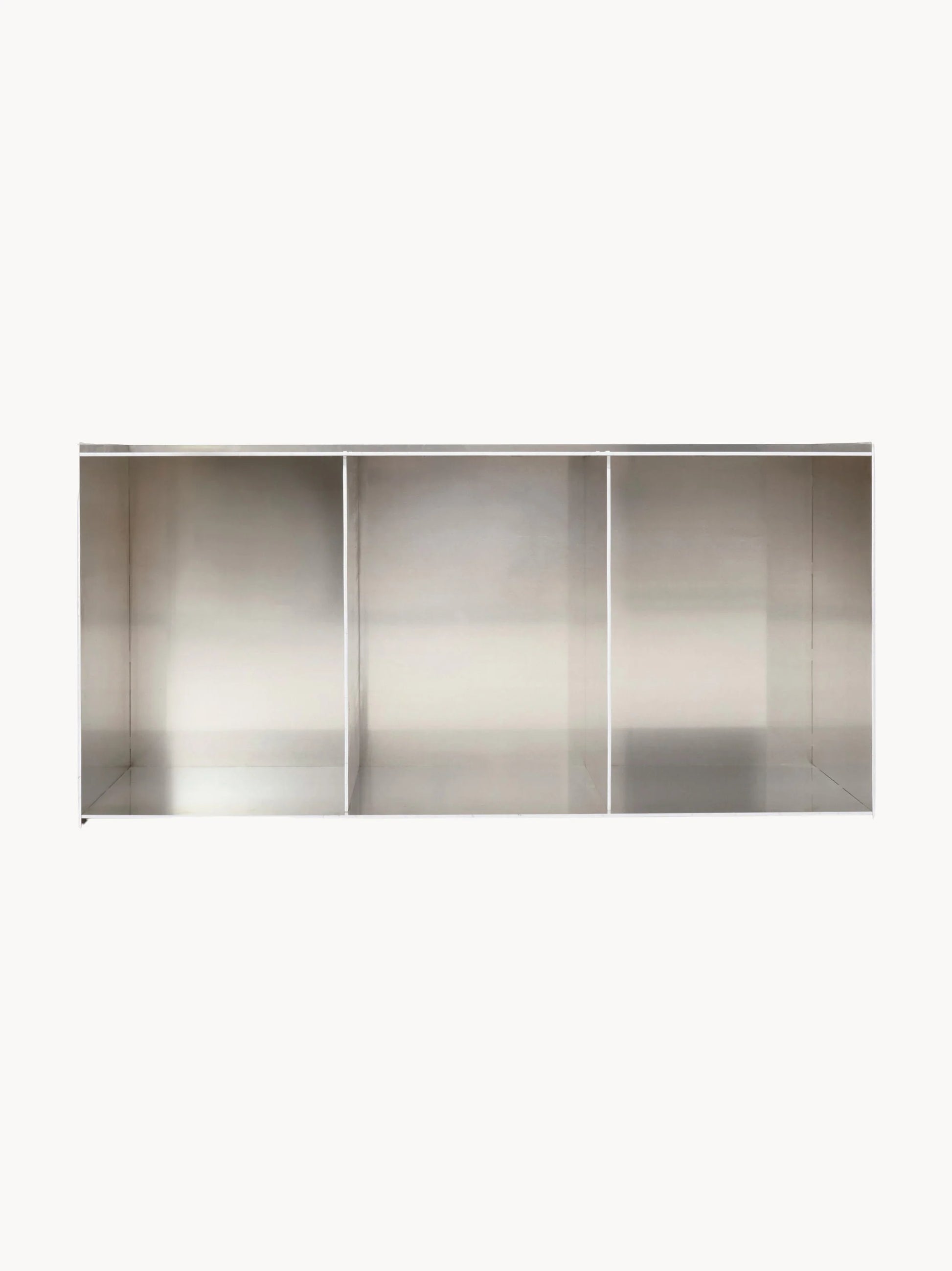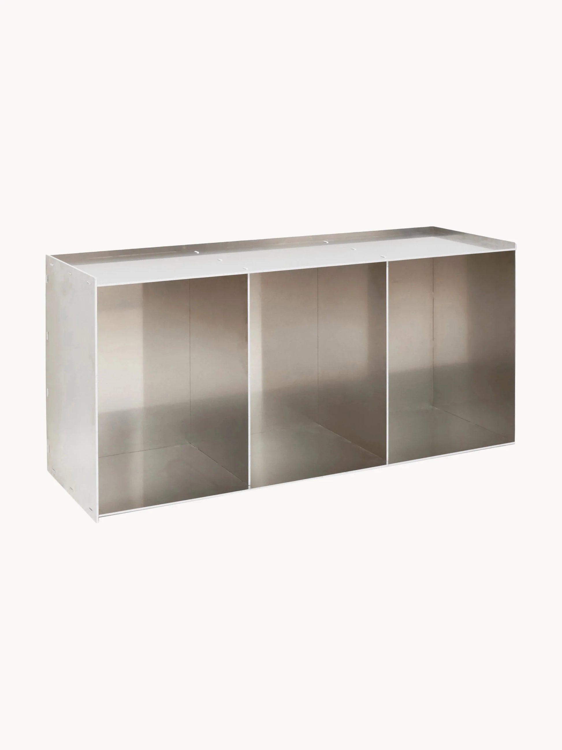 Szafka RIVET zachwyca solidną konstrukcją i wszechstronnością. Można ustawić ją pionowo lub poziomo – sprawdzi się jako stolik, schowek lub miejsce ekspozycji. Jej obudowa powstaje z surowych, laserowo ciętych arkuszy aluminium, łączonych za pomocą techniki nitowania, idealnej do tworzenia prostopadłych połączeń. Całość formowana jest ręcznie przy użyciu młotka w autorskim procesie na zimno, opracowanym przez projektanta Jonasa Trampedacha w 2011 roku. (4).
